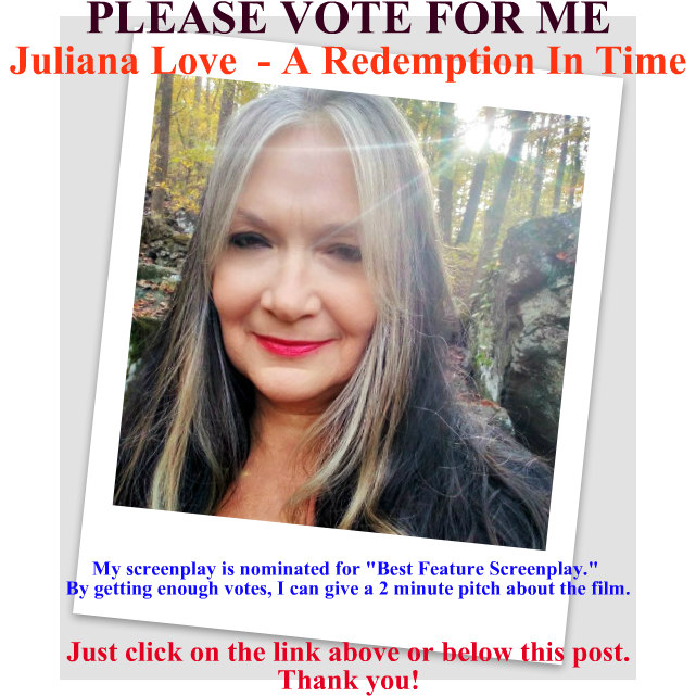 Wow! Only 8 days left till the polls close. I need VOTES. So if you haven’t done so already, can you please click on the link: https://freeonlinesurveys.com/s/Osoq6yUF#/0. It will take you right to the page. Just scroll down to my name, Juliana Love – A Redemption in Time and click on it and then submit. It’s that easy! Those of you in other countries, you can do this too and it is so appreciated.