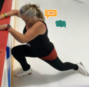 I have lost the strength to skate for the whole lesson and I need to bring my CPAP, and use it in intervals. But because I have also been stretching at home, walking and trying to do things to help my body get stronger, I was also able to do real lunges for the first time, since before COVID. Yes! I am (in the picture below) not smiling because it is hard to hold this pose for long, while not moving.